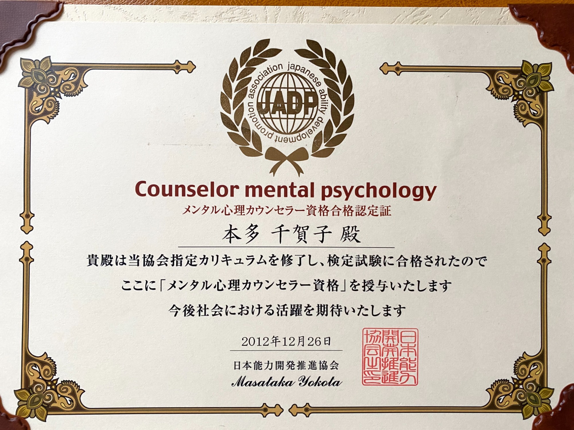 結婚後はメンタル心理カウンセラー(来談者中心療法)の資格を取得し開業する。